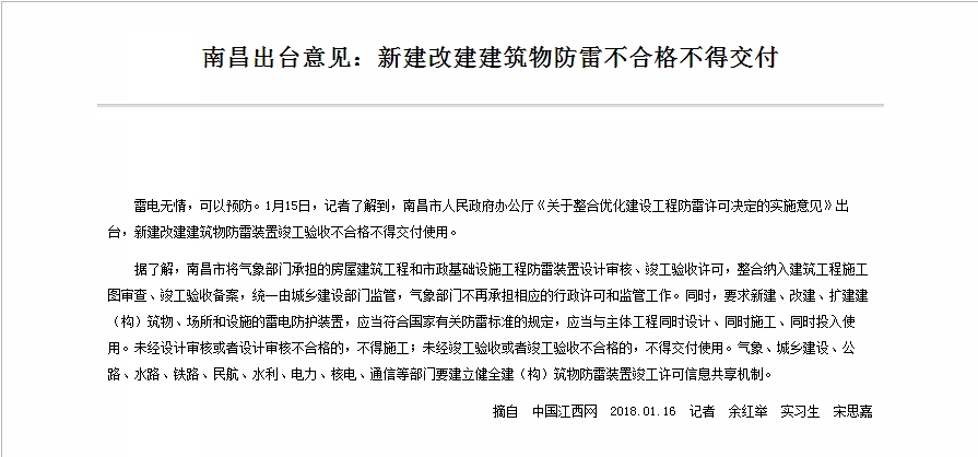 南昌出臺(tái)意見(jiàn):新建改建建筑物防雷不合格不得交付